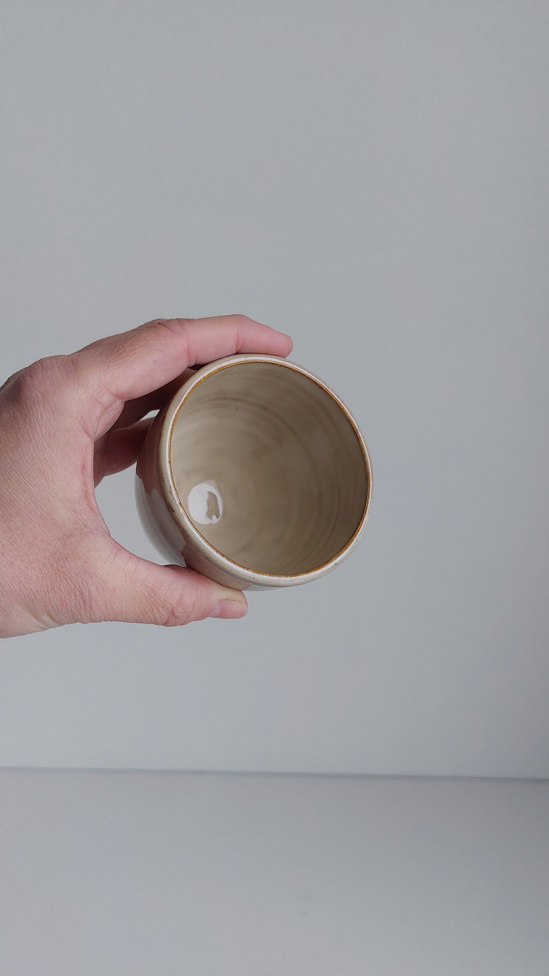 Gedraaide tas afgewerkt met een beige/grijs glazuur.