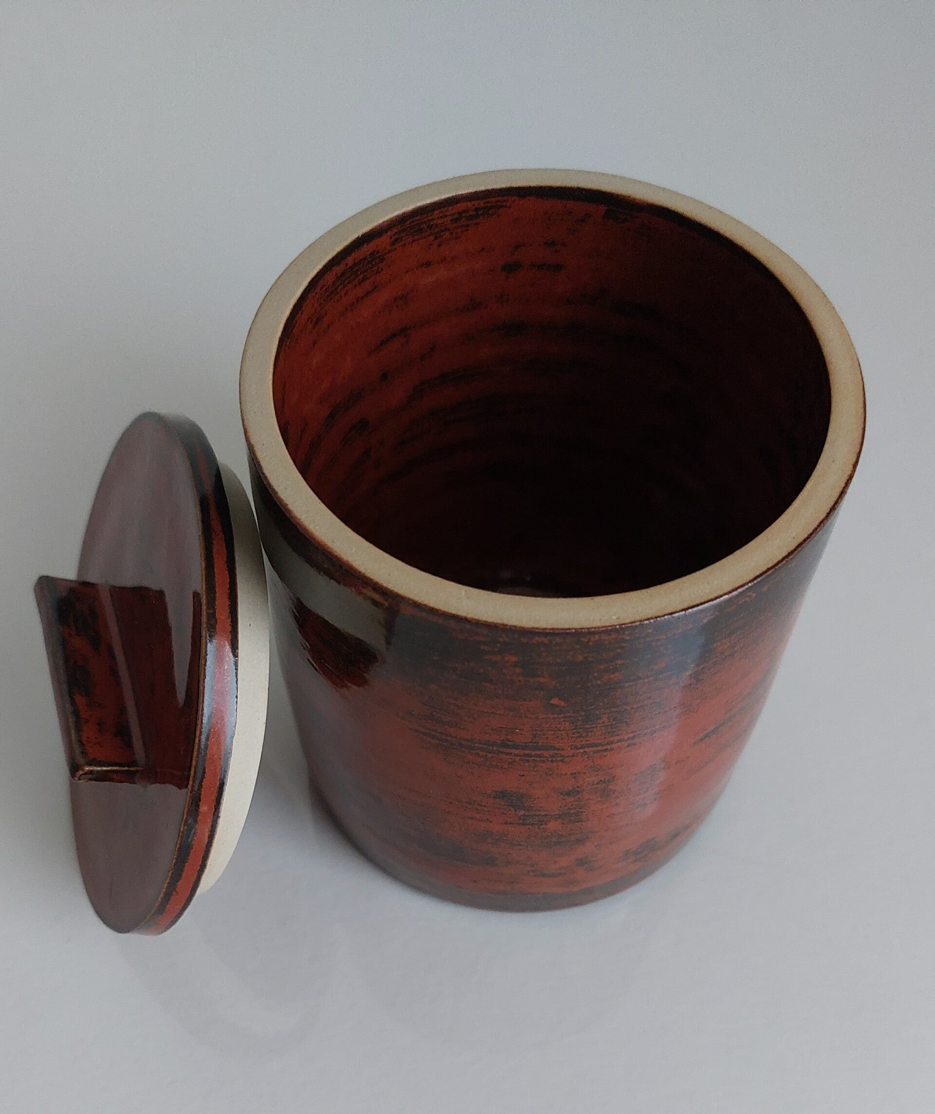 Fijn gedraaide decoratieve of functionele pot met deksel. Afgewerkt met rood gevlamd glazuur.