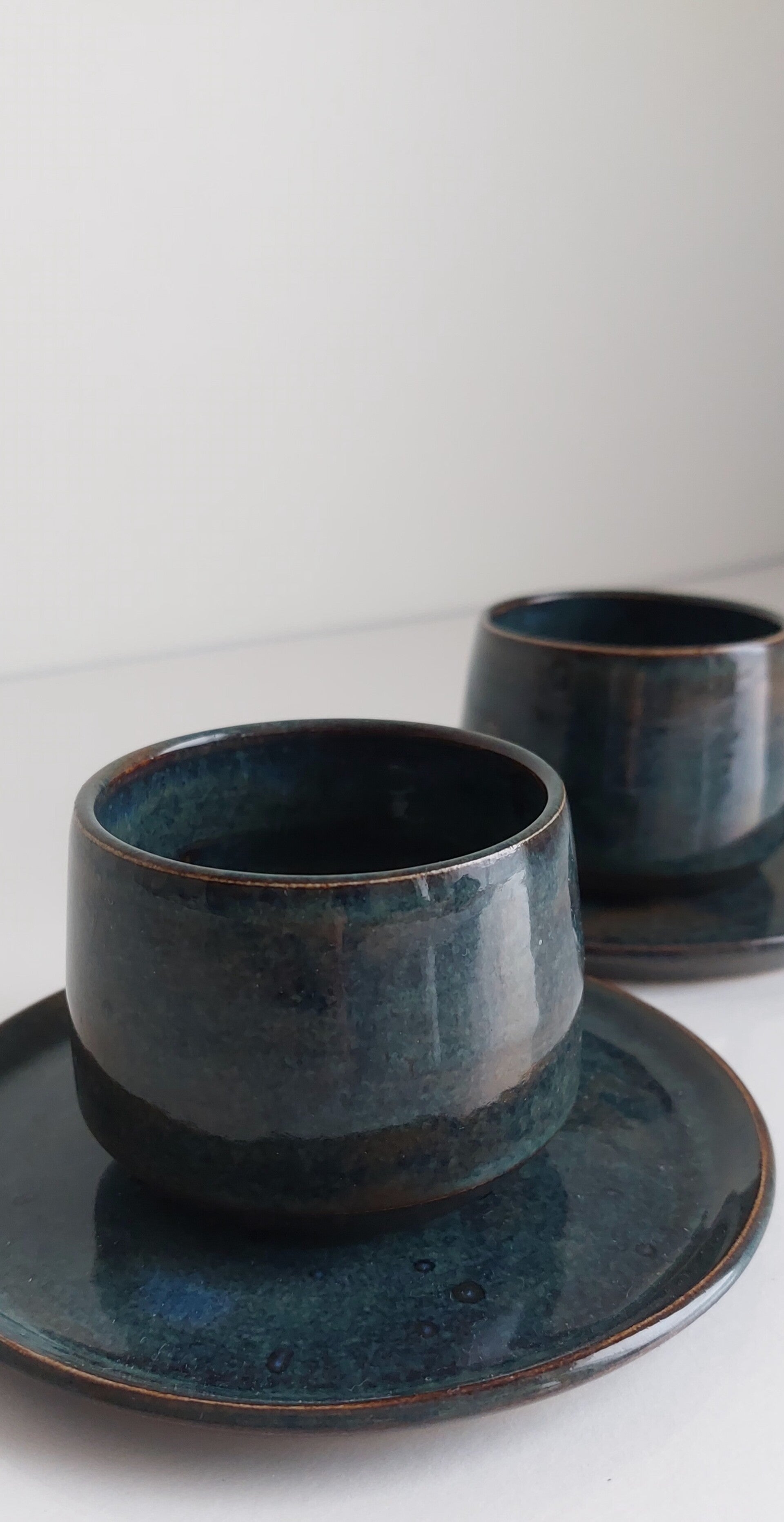 Gedraaide tas met onderbordje in witte klei, afgewerkt met een blauw/bruin glazuur.